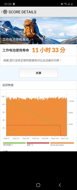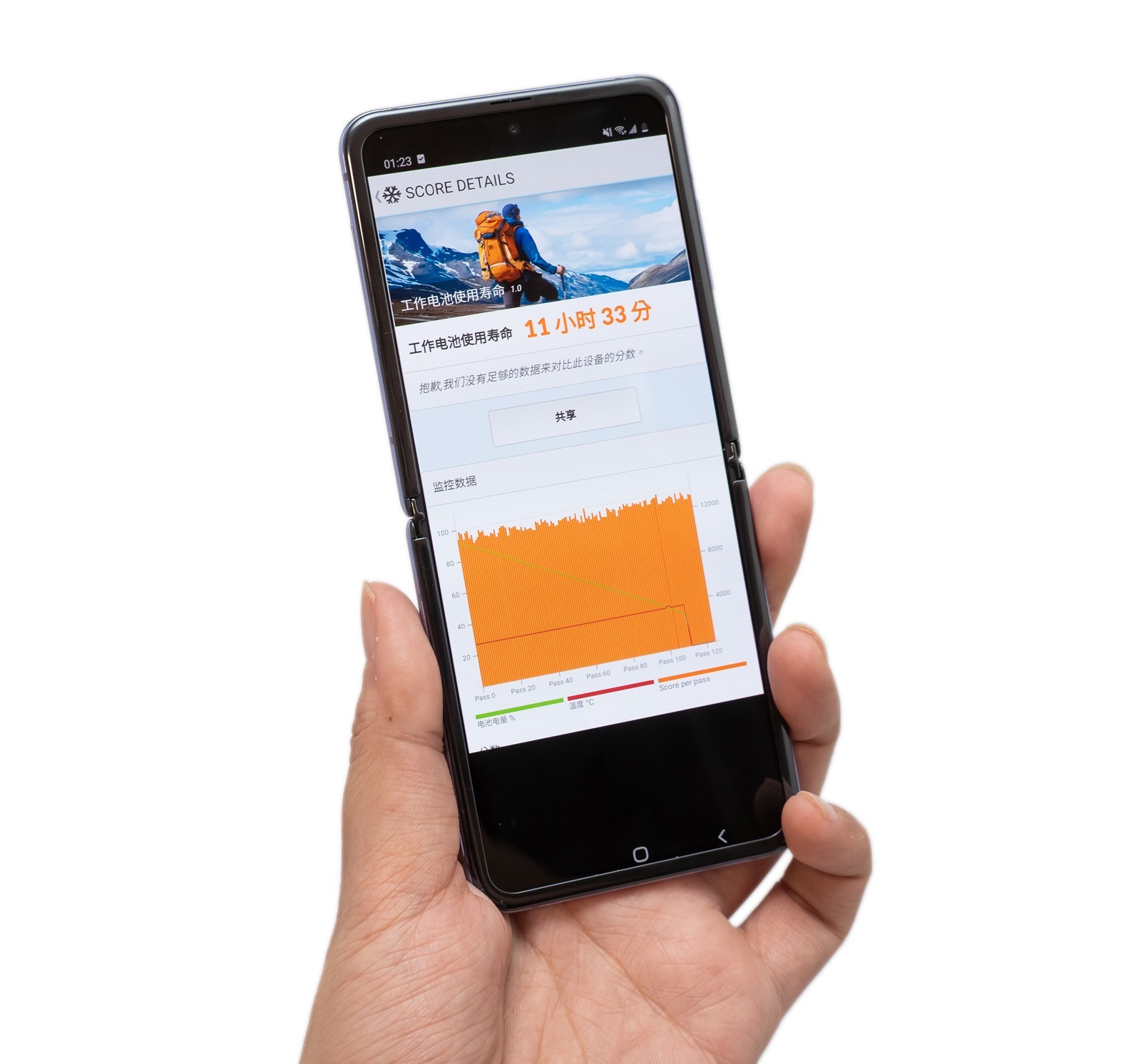 阿輝實際測試 Galaxy Z Flip 內建電池容量為 3300 mAh,實測電力部分以 PCMARK 做標準測試,測試 80% ~ 20% 間的電力運行,模擬上網、工作、遊戲的混合應用,測試結果為 11 小時 33 分鐘,測試方式與標準可以參考這篇說明。