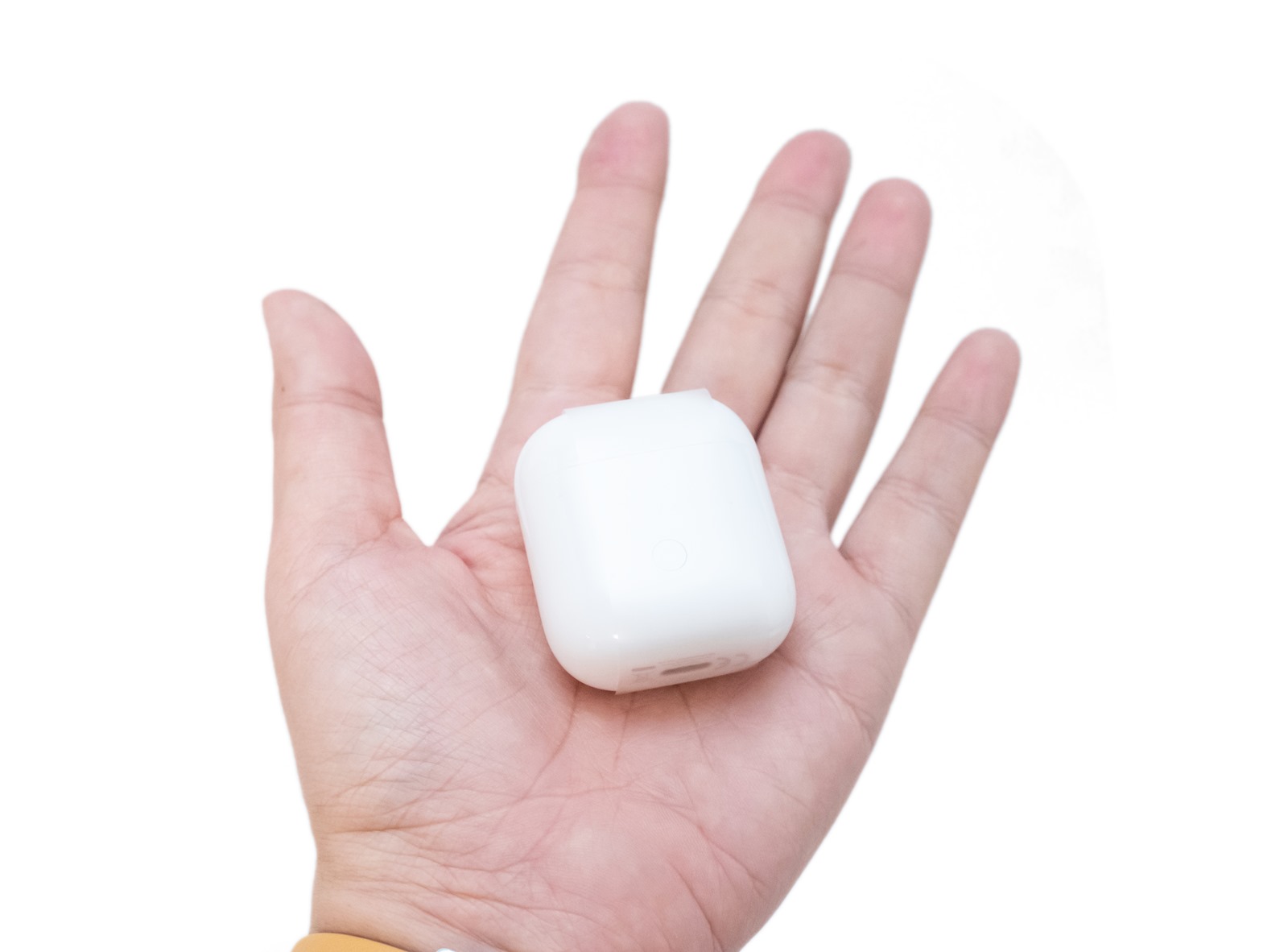 盒體採上下蓋包裝方式,打開包裝後第一個看見的就是裝有無線藍牙耳機的充電盒,白色的充電盒是亮面光滑的質感、尺寸上相當的小巧可愛,是阿輝能夠單手掌握的精緻大小。