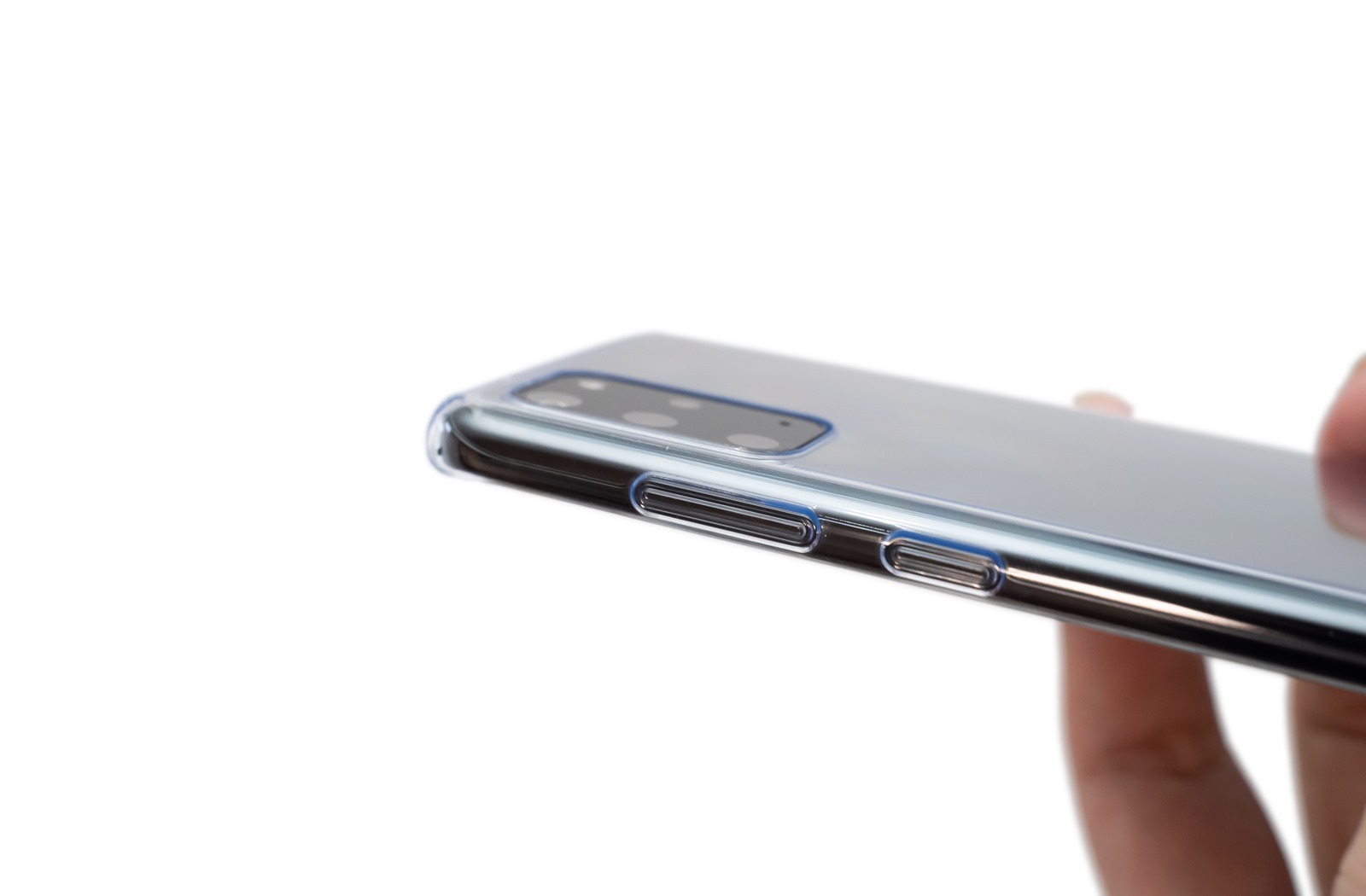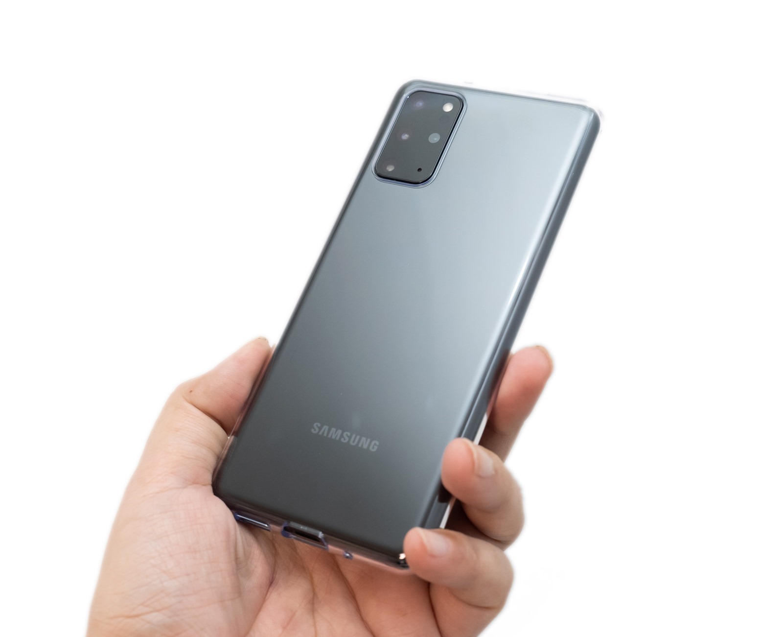 與 S20 Ultra 不同,S20 + 安裝軟殼後鏡頭是低於保護殼,有一定程度保護鏡頭的作用。