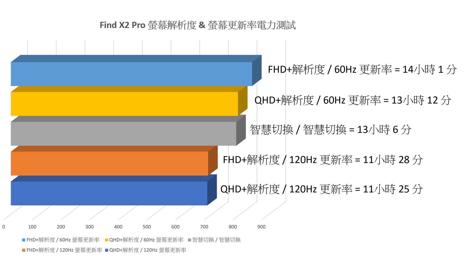 不過也稍微提醒一下這部分實際模擬電力消耗測試的部分是測試 OPPO Find X2 Pro 的預設值,也就是解析度與螢幕更新率都設定在智慧自動的選項組合,至於其他組合的部分,時間真的不夠只能說暫時先這樣了,也許以後有時間再補上。