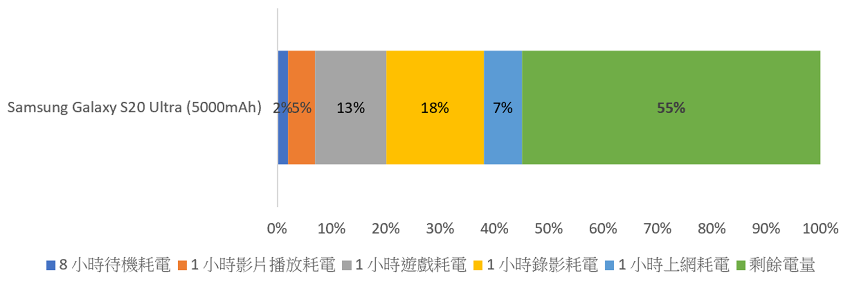 - Galaxy S20 Ultra 瀏覽器連續讀取瀏覽 1 小時,實際消耗 7% 電量,剩餘 55% 電量