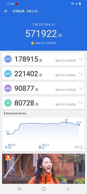 Galaxy S20 Ultra 採用 S865 處理器與 12GB 內建記憶體的規格配置,更多資料也可以阿輝資料庫 https://reurl.cc/MxdjK ,資料庫中包含超過 200 支以上以上阿輝多年測試的實測數據,可以給大家作為對照參考使用。