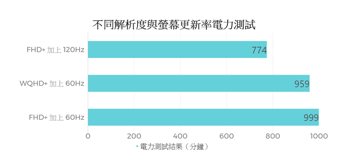 - 解析度 FHD+ 加上 60Hz 畫面更新頻率測試結果:16 小時 39 分(999 分鐘)