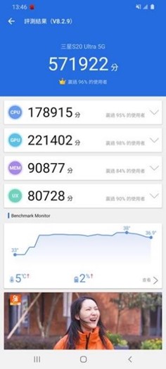 Galaxy S20 Ultra 5G 採用 S865 處理器與 12GB/16GB 內建記憶體的規格配置,更多資料也可以阿輝資料庫 https://reurl.cc/MxdjK ,資料庫中包含超過 200 支以上以上阿輝多年測試的實測數據,可以給大家作為對照參考使用。