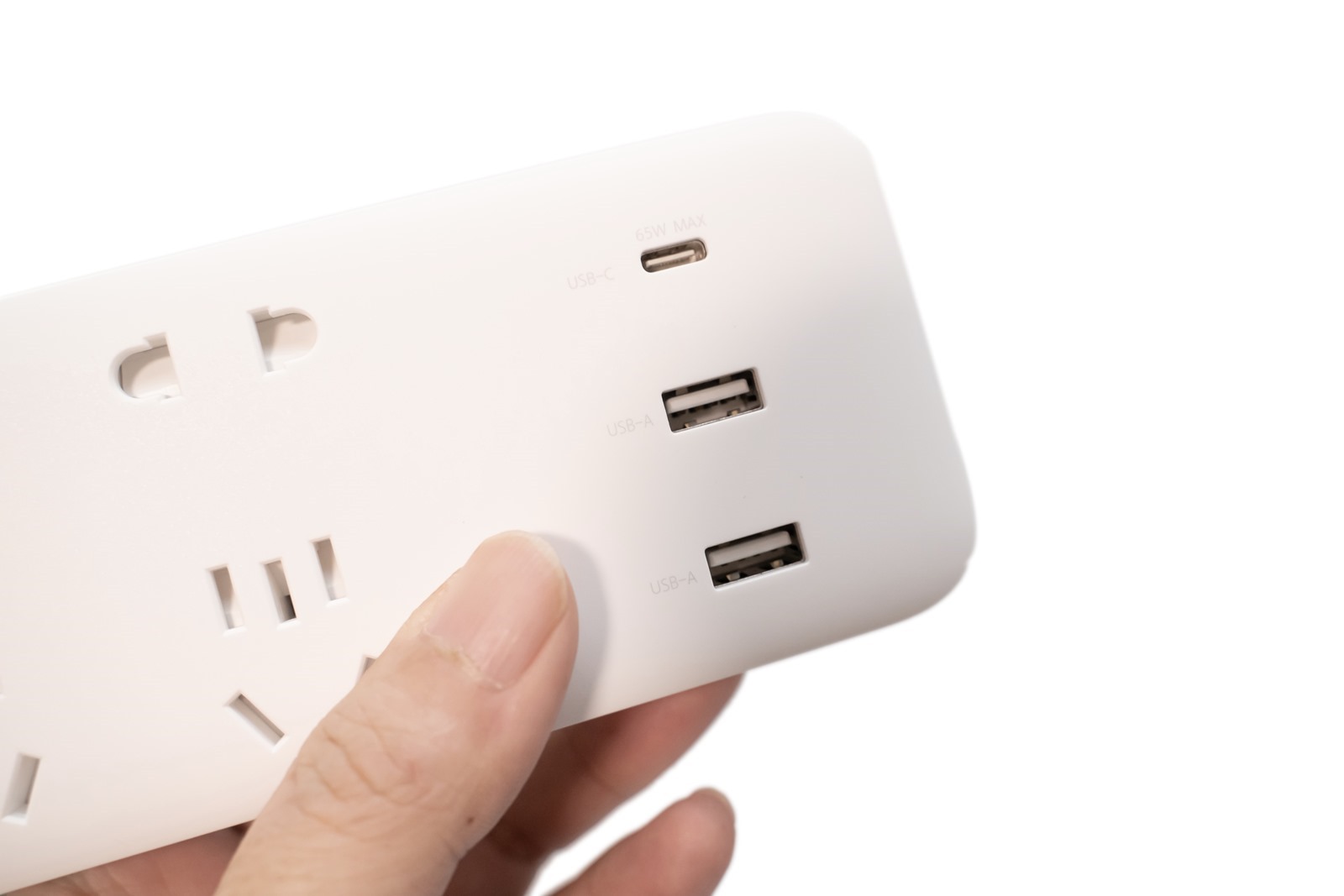 背面標註了產品相關資訊,其中最重要的應該就是 USB 部分支援 100 ~ 240V 寬電壓所以台灣使用沒有問題;然後 USB-C 單口:5V/3A 、 9V/3A 、 12V/3A 、 15V/3A 、 20V/3.25A,也就是單口最大支援 65W 輸出,而多口使用時 USB-C 最高則是 45W;兒而 USB-A 單口使用時支援:5V/3A 、 9V/2A 、 12V/1.5A 最大 18W,而雙 USB-A 同時則是共用 5V/3A 最大 15W 。