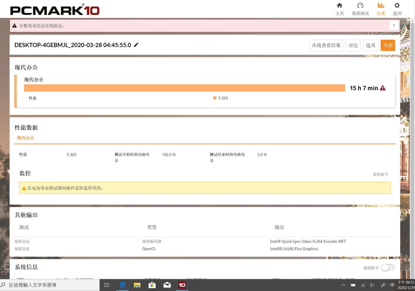 大家最為期待的續航力測試,阿輝使用 PCMARK 10 的電力測試,以現代辦公模式測試,可以達到 15 小時的優異續航成績!