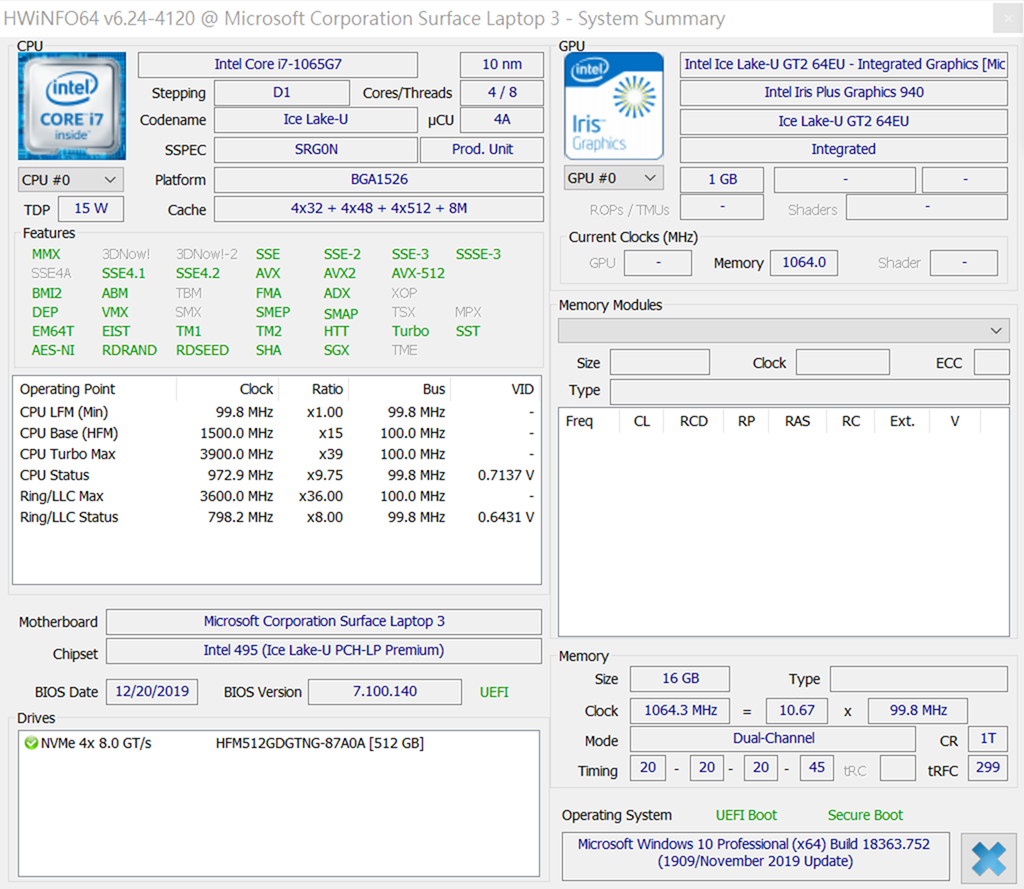 阿輝測試的這款 Surface Laptop 3 預設就直接搭載了 Windows 10 Pro 作業系統,內建 16GB 記憶體,512GB SSD 固態硬碟的配置,使用的處理器是 Intel 最新第十代 Intel® Core™ i7-1065G7 處理器,採用 10nnm 製程,具備四核心八線程,並採最新 Intel Iris Plus 繪圖晶片。
