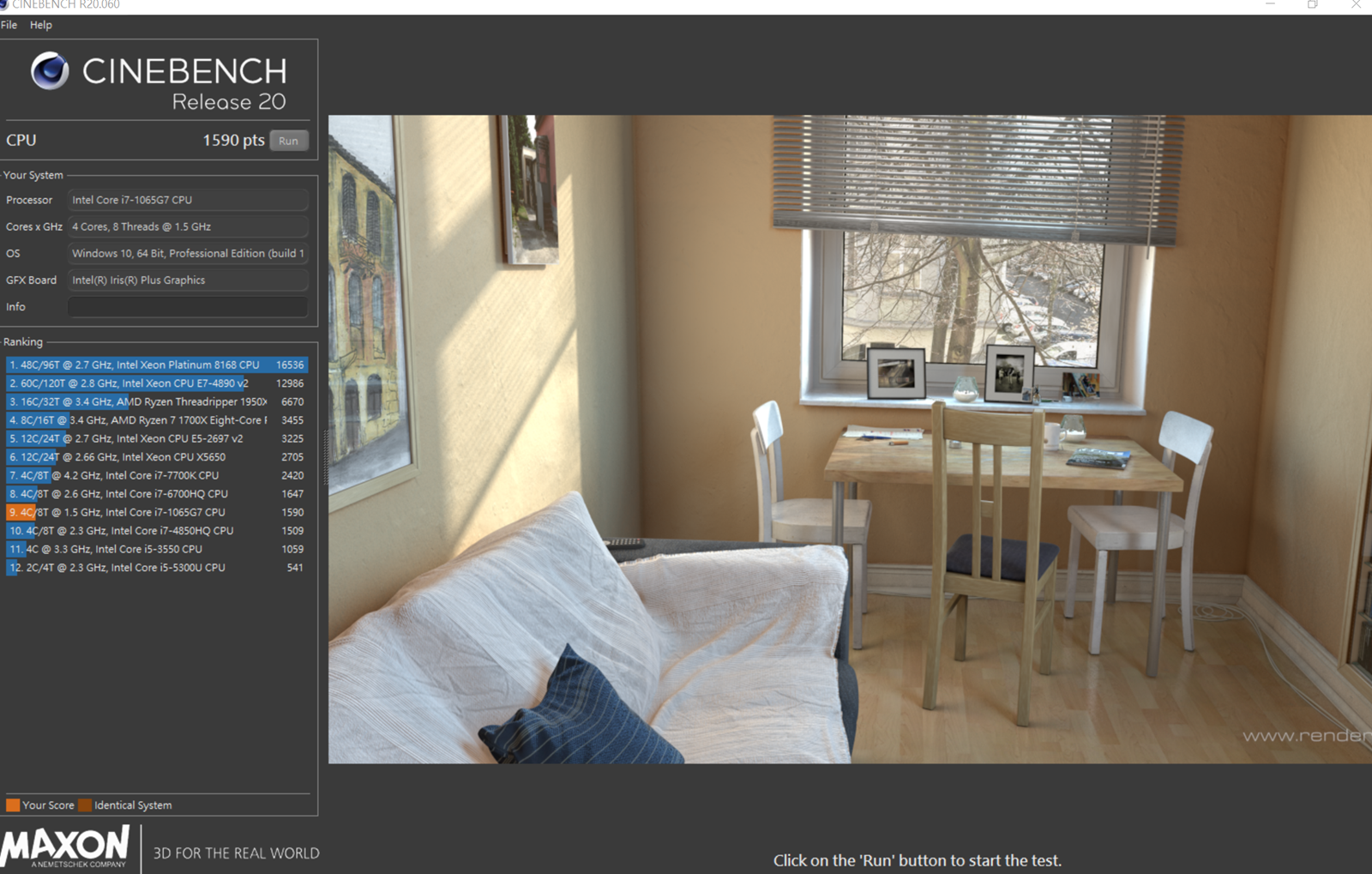 最新版 CIBENCH R20 測試模擬重度的 3D 繪圖渲染能力,得分為 1590 分