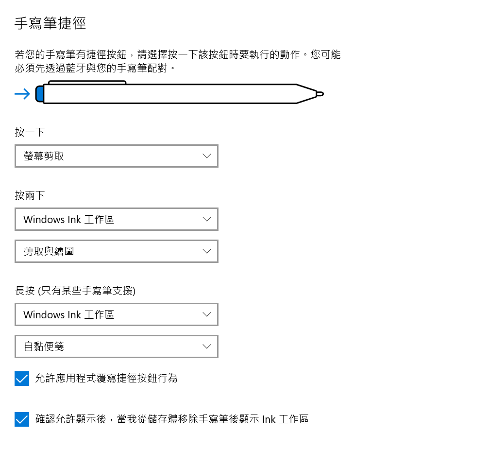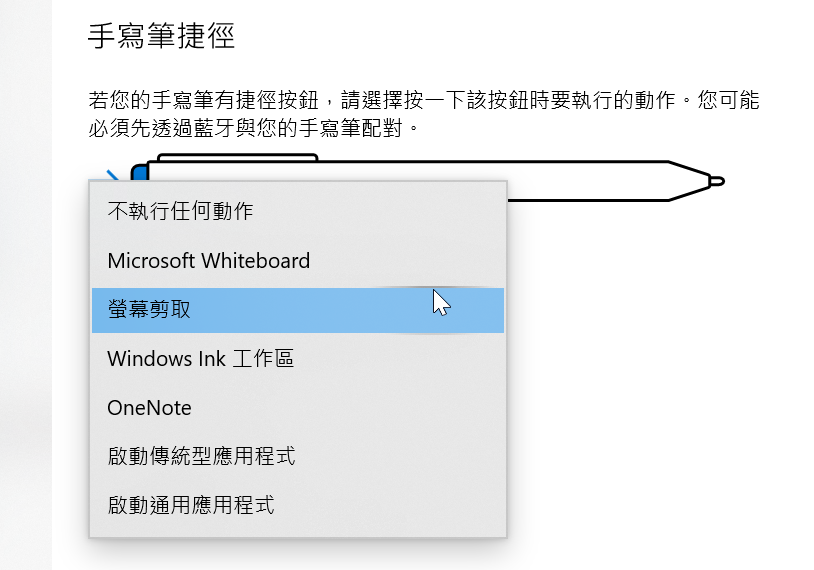 不只如此,手寫筆也可以設定快捷鍵,配合不同的工作習慣提供不同的協助。比方說常常需要擷取螢幕的偵探界人士,就可以將手寫筆尾端的按鍵設定為螢幕剪取,只要對著螢幕想剪取的地方按下就能剪取螢幕。