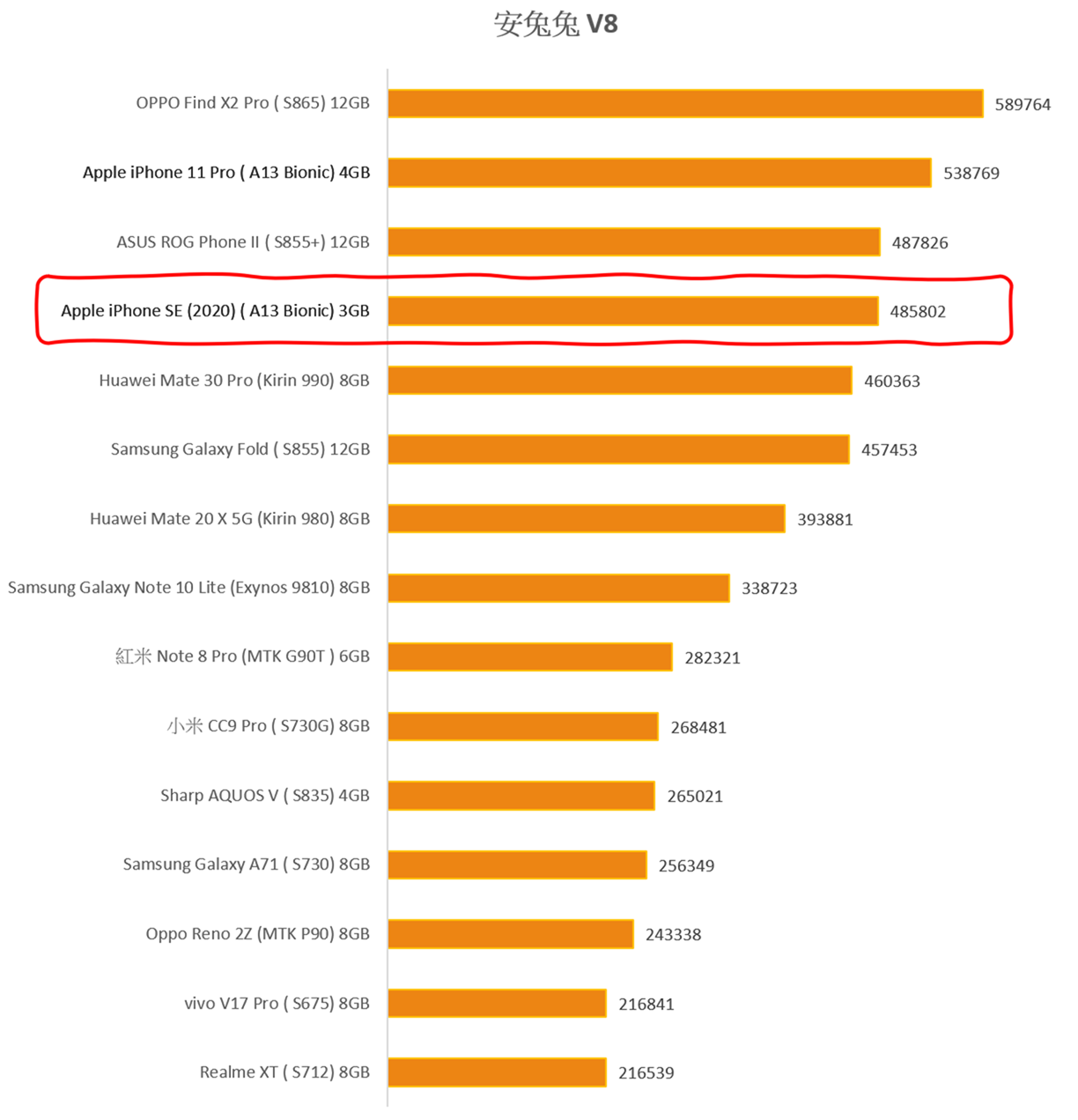 iPhone SE 目前測試和傳聞都是 與 iPhone 11 / iPhone 11 Pro / iPhone 11 Pro Max 都是採用相同的 A13 Bionic 處理器,而記憶體則是稍微小一些的 3GB 記憶體規格配置 (11 系列則全系列都是 4GB),下圖會彙整排序的圖表(以綜合性能排序)