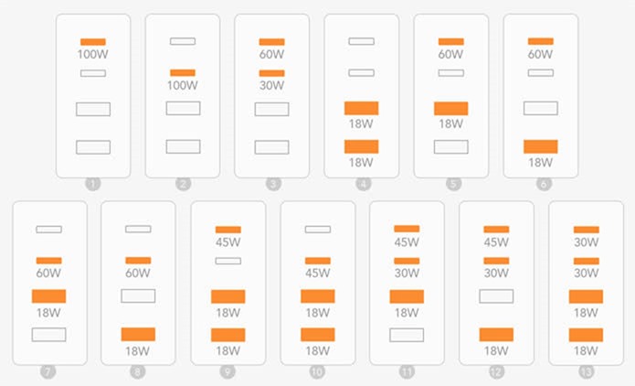 每組 USB C 都最高支援 100W PD 輸出,每組 USB A 則是 18W 輸出,多口同時使用的時候則會自動切換充電功率,這是全自動的使用者不需要擔心或是選擇。