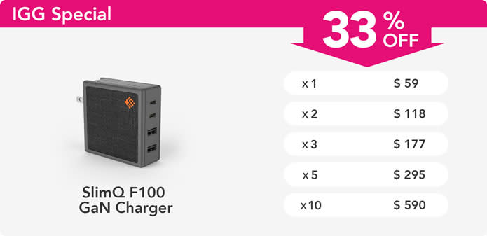SlimQ F100 是迄今為止世界上最小的 100W GaN 充電器,具有完整的 PFC 功能可真正在全球使用。使用新一代 GaN 氮化鎵技術實現小尺寸和高功率,它可以同時為多達 4 台設備充電,從耳機到手機,再到平板電腦甚至是 MacBook Pro 16 充電都沒有問題。 SlimQ F100 設計精美,並支持近代手機和筆記型電腦的大多數快速充電協議。