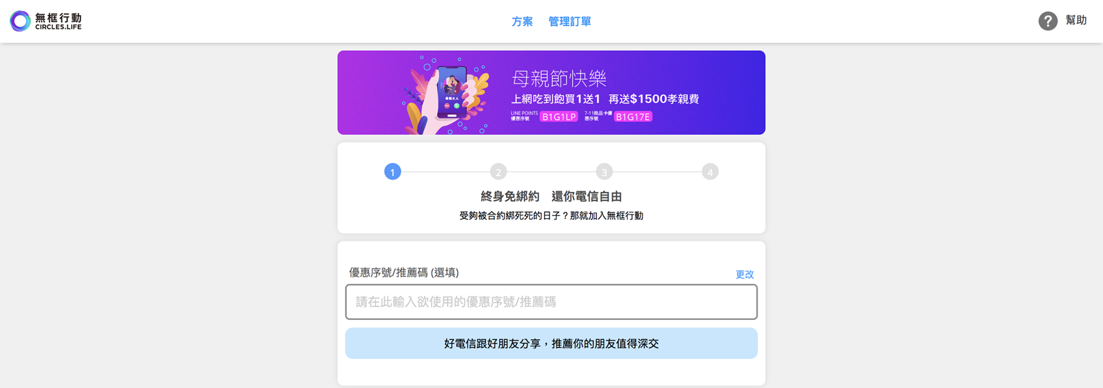 只要連上官網,按下「我要申辦」,即可開始按照網頁指示步驟一個些一個點選,簡單、直覺,誰都能輕鬆申請!第一步驟就是先選擇方案,同時可以填寫優惠序號,比方說想要申請母親優惠的,就把序號填入這邊。