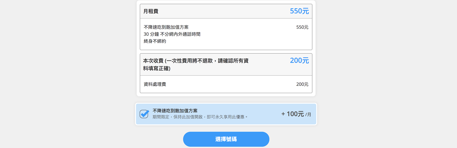 接著選擇方案。值得注意的是雖然不綁約,但是有處理費,所以不要覺得好玩亂申請,也要注意所有填寫的資料都正確無誤,因為這筆錢不能退費啊。