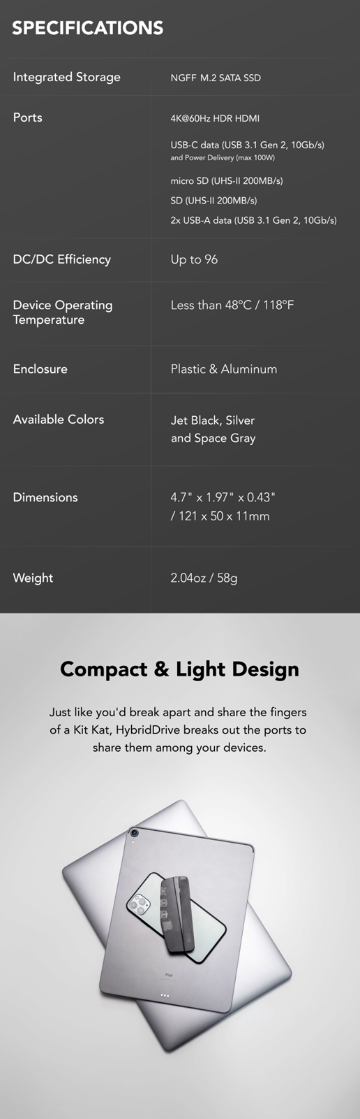 當今有如此眾多的 USB 設備和外接設備,而筆記型電腦上的內建接口卻越來越少;儘管 HybridDrive 設計為適合 Apple MacBook Pro 使用,但您也可以將用在任何支援 USB C 連接的設備上,例如智慧手機,平板電腦,PS4 和筆記型電腦。
