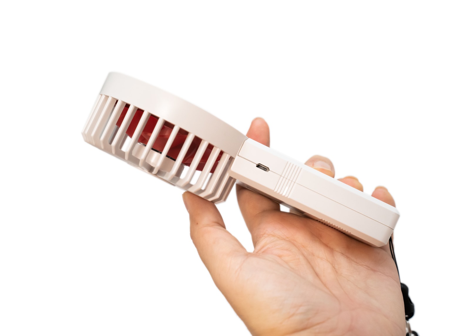 讓人隨身攜帶方便的手腕帶,則是可以繫在風扇手把的底部小孔洞上頭,手腕帶上的腕帶大小套在手腕上非常剛好,扣環和鑰匙圈的設計則是能把風扇和鑰匙圈串在一起或是扣上證件帶都非常方便。