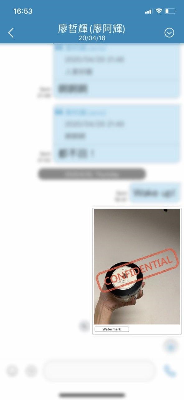 怎麼做呢? 在傳送圖片時,點下浮水印,就會看見標籤轉換顏色,表示已經啟動浮水印功能,傳出這張照片後就可以看到上面已經壓了浮水印。