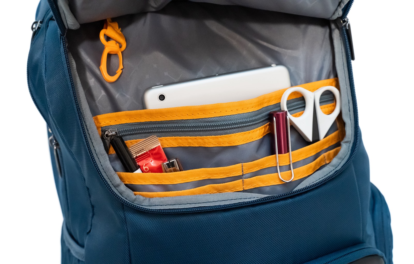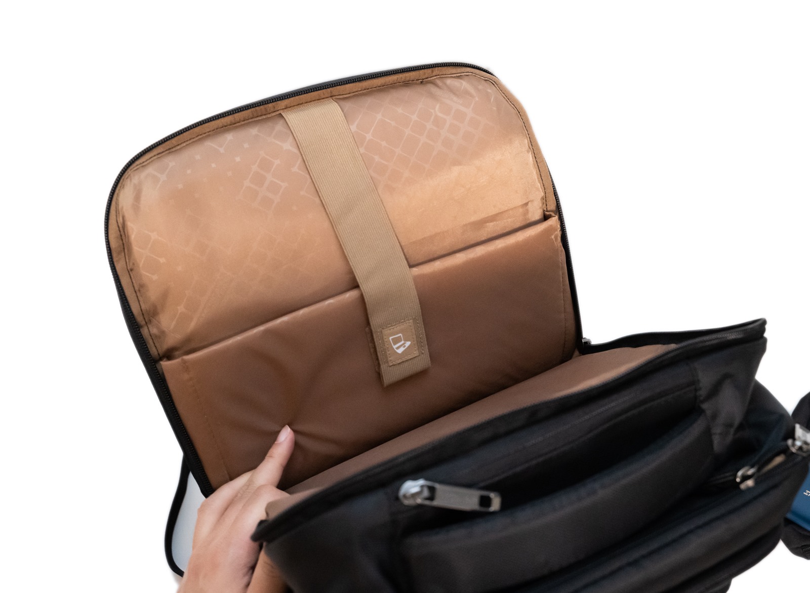 然後所謂可鎖筆電收納層也是非常聰明的設計,以往的背包設計都只有一個拉鍊開關,然後額外自做筆電專用夾層,即便拉鍊設計得可以上鎖也相當麻煩,畢竟只能選擇一次全部鎖上增加拿取東西的麻煩,或是讓相對昂貴的筆電跟包包裡面不值錢的雜物處在一樣的被盜風險之中。