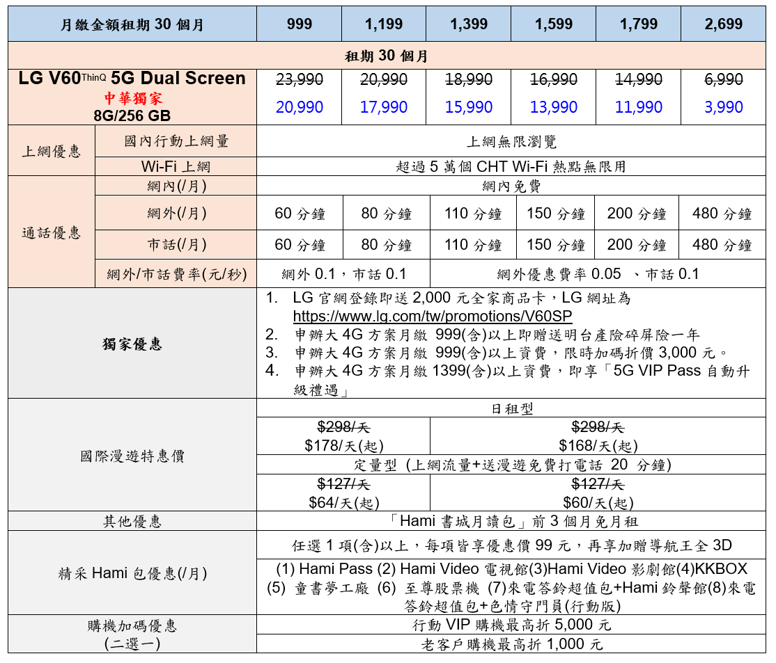 中華電信LG V60ThinQ 5G Dual Screen大4G購機方案
