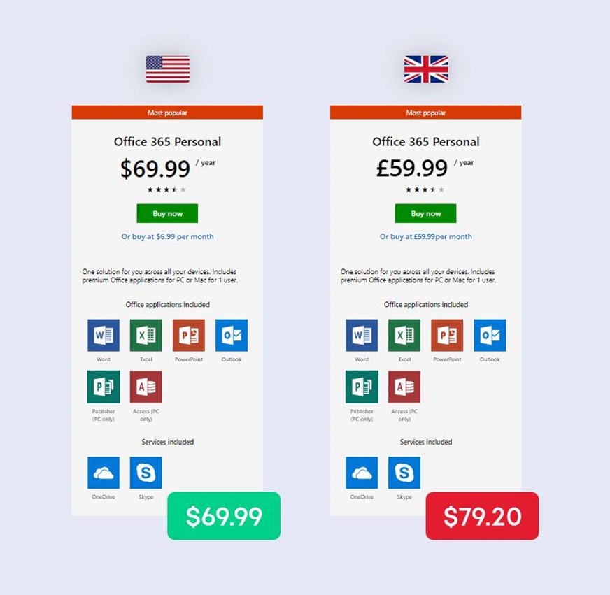 這件事情應該不做的話是沒有人知道的,其實蠻多網路上的產品,從不同國家購買的話,價格都會有些許的落差,像是世界各國都有的微軟,他們旗下產品 Office 365,如果你從台灣跟美國來看他們官方網站上的售價的話,其實相差無幾。但是如果你切換到英國的微軟的話,你會發現,換算過後的價格兩者相差了 10 元美金,幾乎是 300 元台幣!而至於要如何讓自己跳板到英國的微軟來買軟體,那當然就是透過 Ivacy VPN 來幫你搞定了!