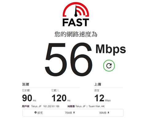 而實際透過電腦的 Chrome 瀏覽器,安裝 Ivacy VPN 的專用外掛,連線到日本伺服器後,透過 fast.com 來進行測速的話,實際測得速度為下載 56mb,上傳 12mb,同樣的用來對付最耗網路的串流影音服務是不成問題的。