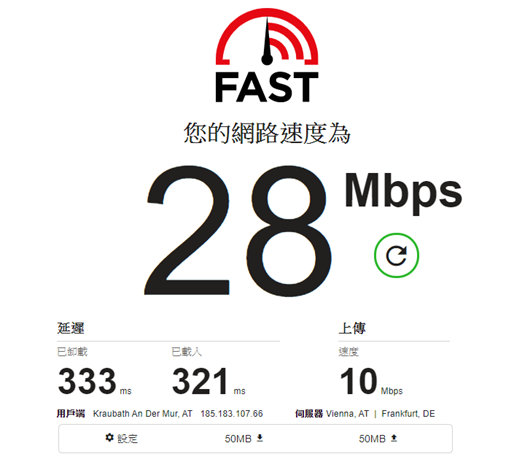 最後在透過電腦的 Chrome 瀏覽器,安裝 Ivacy VPN 的專用外掛,連線到澳洲伺服器後,透過 fast.com 來進行測速的話,實際測得速度為下載 28Mbps,上傳 11Mbps,同樣的也是有著不錯的表現。