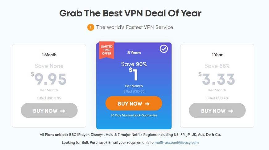 就像前面所說的,穩定、速度又快,而且還不限流量,這樣集各種優點於一身的 Ivacy VPN ,費用應該很貴吧?放在平時的確是如此,官方網站上的價格為單買每個月的話為 9.95 美元,一次購買一年的話為 40 美元,但近日 Ivacy VPN 正在舉辦特惠活動,『五年份的 Ivacy VPN』僅需要 60 美元,90% 的驚人折扣!每個月僅 1 美元不到台幣 30 元,這真的是個讓人心動!長期在網路上找尋資源、使用串聯影音服務等有需求的人不可錯過的優質特惠,而就整起來看,即便是沒有剛性需求,但偶爾就是要在網路上找尋資源的網友,60 美元換五年不限流量的高速 VPN 服務,其實也是個非常划算的價格,總比自己真的要用的時候,硬是支付那些高額、但又不知道連線品質的 VPN 費用來的好吧?(而且活動時間快到了,真的要買要快!!)。