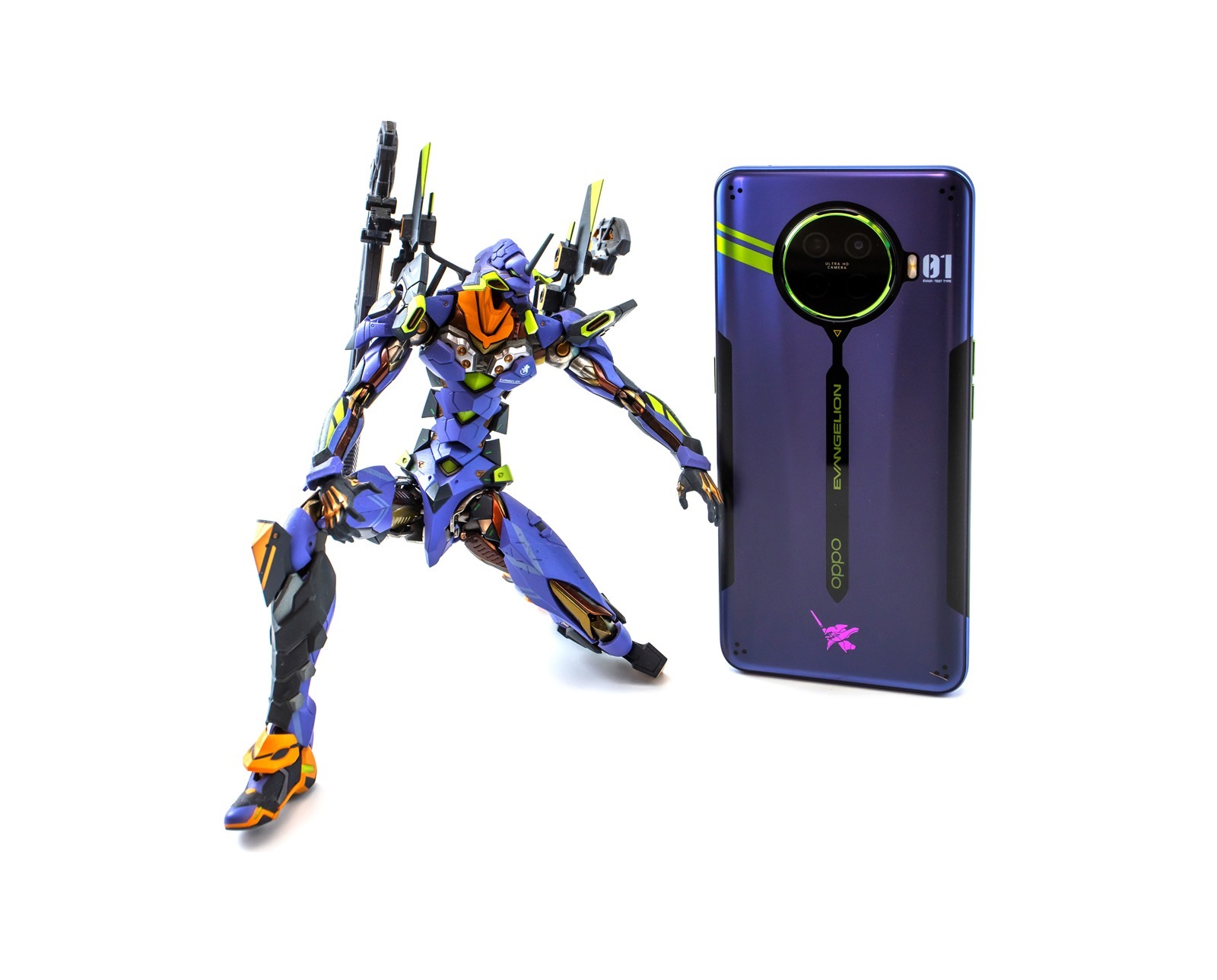 去年阿輝就有入手和大家分享 Reno ACE 鋼彈版本,沒想到上個月突然就出現 Oppo Reno ACE 2 與 EVA 新世紀福音戰士的聯名限定版本啊!這阿輝怎麼能忍?!!OPPO ACE2 EVA 新世紀福音戰士限定版是以初號機為設計(手錶是二號機,真無線藍牙耳機是零號機),機身採用初號機的紫綠搭配設計,設計中呈現非常多機身紋理與裝甲特色,還不僅手機而已,是從快遞外包裝、產品包裝盒到卡針、耳機、保護殼、充電器線材配件,全都是細節都是滿滿的 EVA 元素。