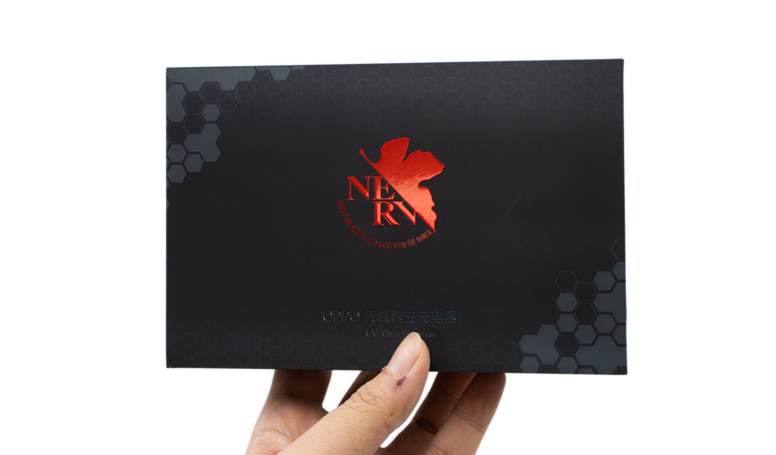 阿輝也一併入手也是 EVA 風格的特別板 Air VOOC 無線閃充充電器,與白色的一般版不同(大哭,阿輝有買一般版本),充電器機身灰綠配色,設計靈感是源於 Nerv 本部的地下城市,進入閃充狀態時還會有特別的 AT 力場絕對領域充電動畫