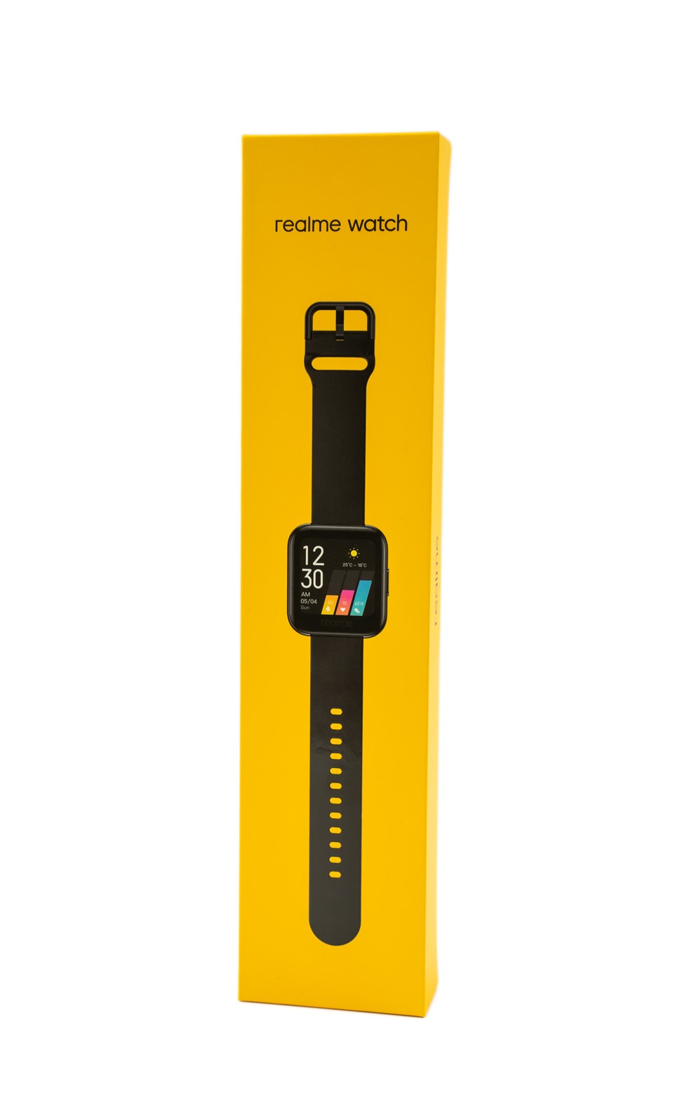 realme 智慧手錶的外包裝盒相當俏皮可愛,是那種校車的飽和鵝黃色,配合阿輝拿到的黑色手錶,對比很強烈,讓盒身感覺更鮮豔,黑色手錶更顯 realme 一貫街頭潮流的風格。