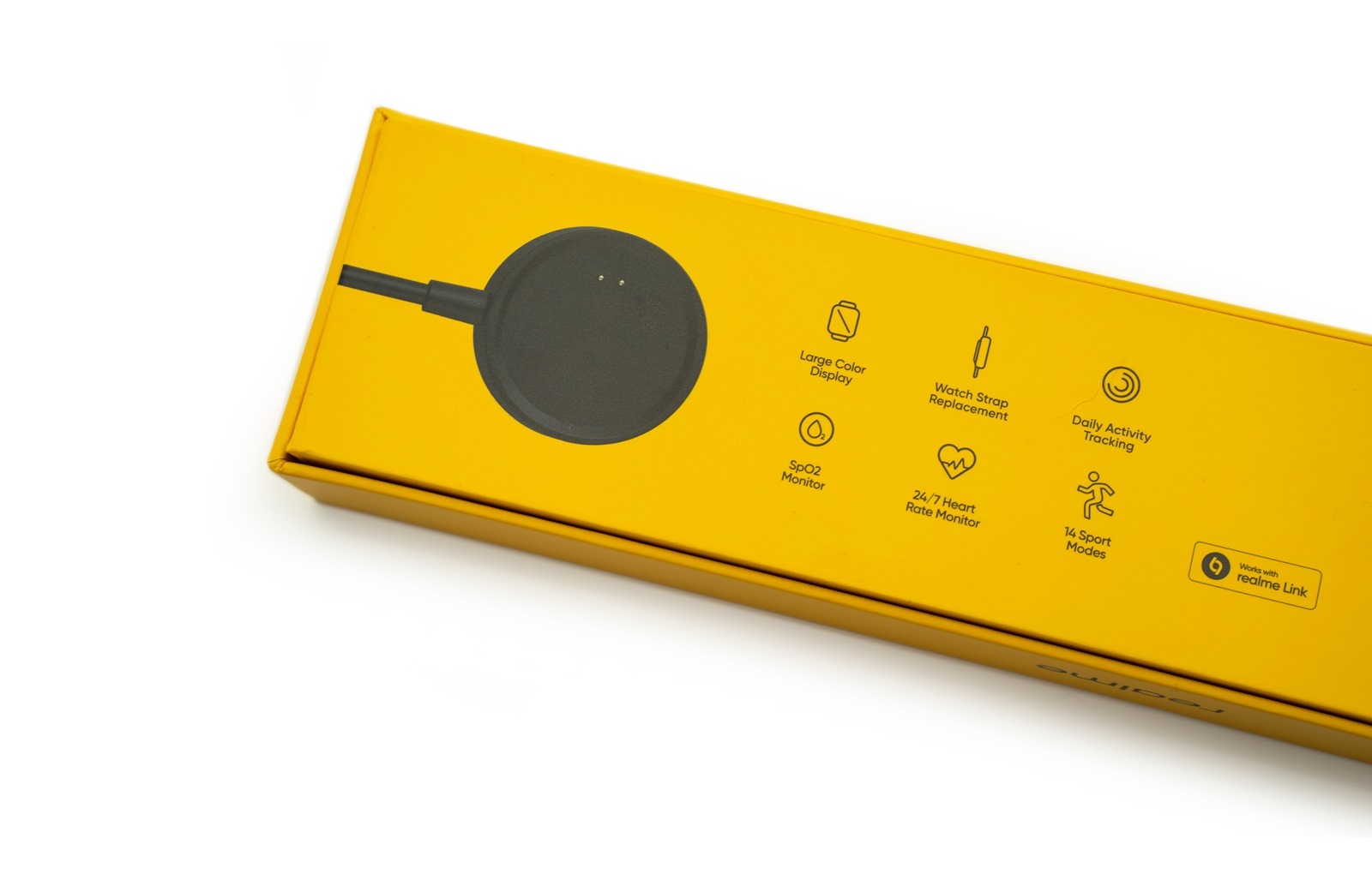 光是盒子就可以看得出 realme 智慧手錶的超值精緻感,盒子材質厚實,設計簡約,清楚寫了品項還有 realme 智慧手錶清晰的美照。不過這個版本並非正式版,盒子正面產品圖還有調整的可能,但質感是不會有落差。