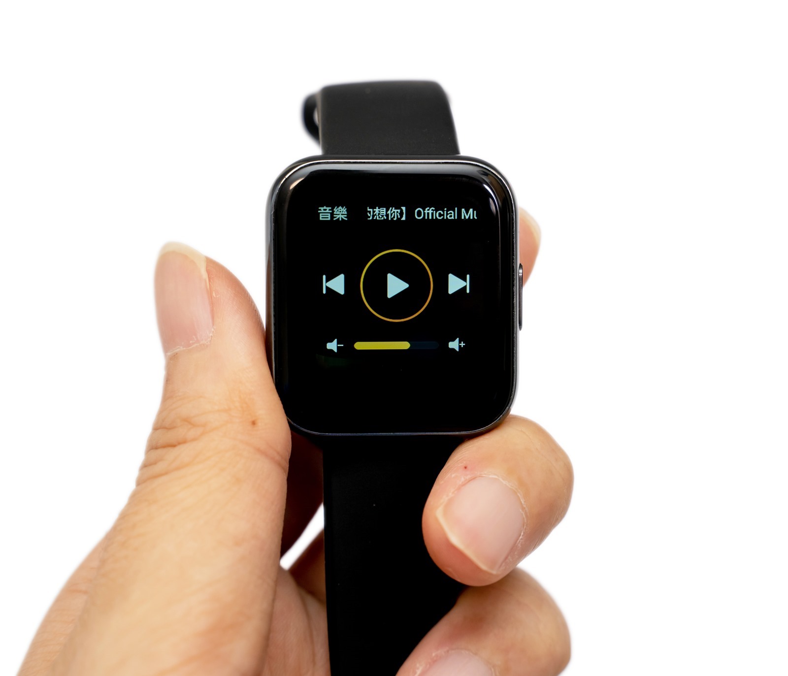 當然,畢竟是智慧型手錶,當然也可以直接用它拍照、放音樂來聽聽,只要擊點圖示就可以進入介面,使用方式超級簡單,可以透過手錶操控播放暫停、換首歌或是調整音量。