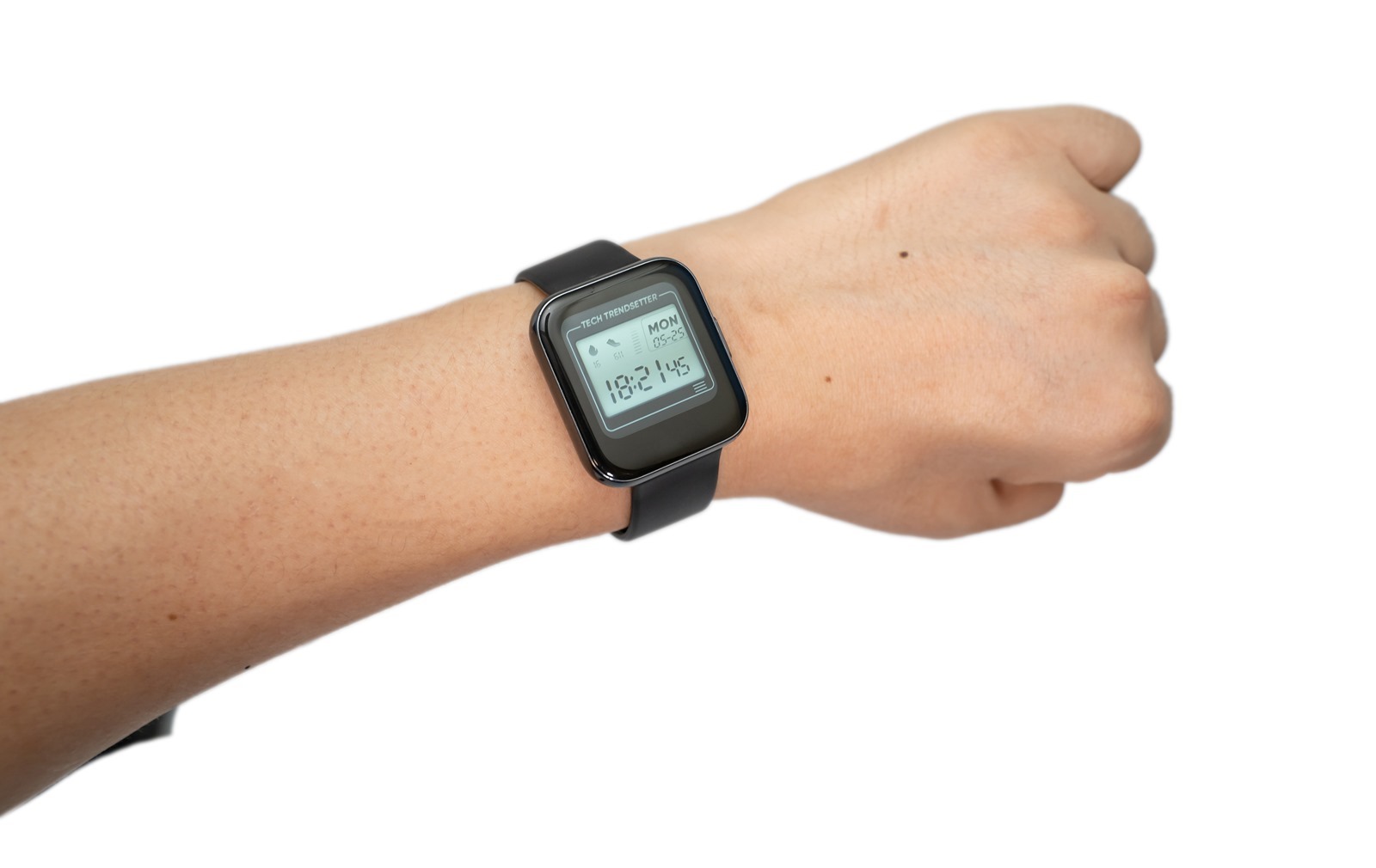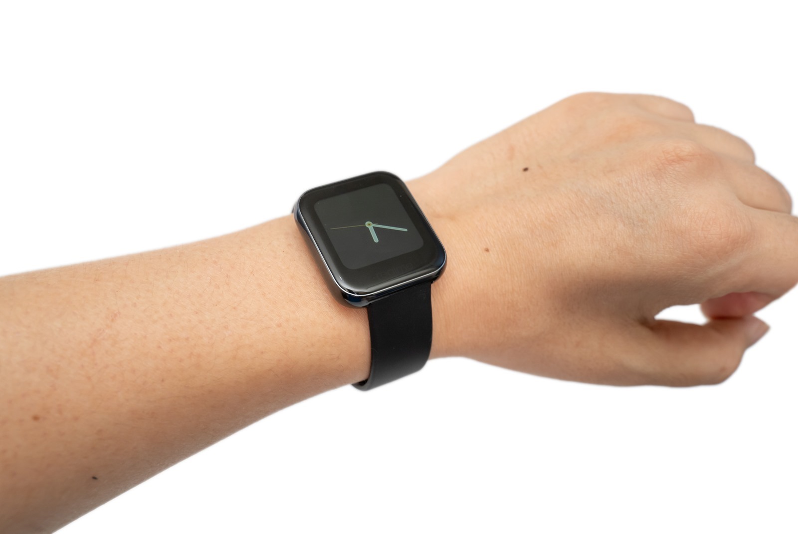戴上手腕看起來也很不錯,方形錶面乍看真的很像 Apple Watch ,錶帶採用親膚的矽膠材質,相當 Q 彈,手感很微妙,很像蒟篛,不過貼在皮膚上觸感很好,不會有黏膩的噁心感,加上這種軟材質的錶帶,更是增加了手錶本身的溫度,使用也很簡單,只要扣上孔洞穿過挖開的開口就好了。