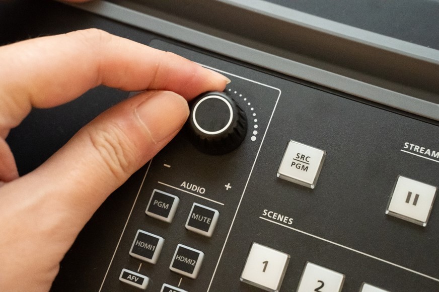 除了場景之外,也可以切到音訊部份看看,也就是對應到面板上的 HDMI1 / HDMI2 / MIC / AV 的調整項目,在 UC9020 面板上主要是控制全局音量與靜音最重要的操作還有切換訊號源,而在 UC9020 的音訊面板中則是可以詳細的設定每一個音量的大小。然後 HDMI1/HDMI2 的音量選項上除了一般的 ON 開關之外,還有一個 AFV 選項,其實就是跟著 HDMI『視訊』的使用來切換,例如 HDMI1 影像有出現那聲音就也會一起播出,這也是蠻常使用的設計方式。
