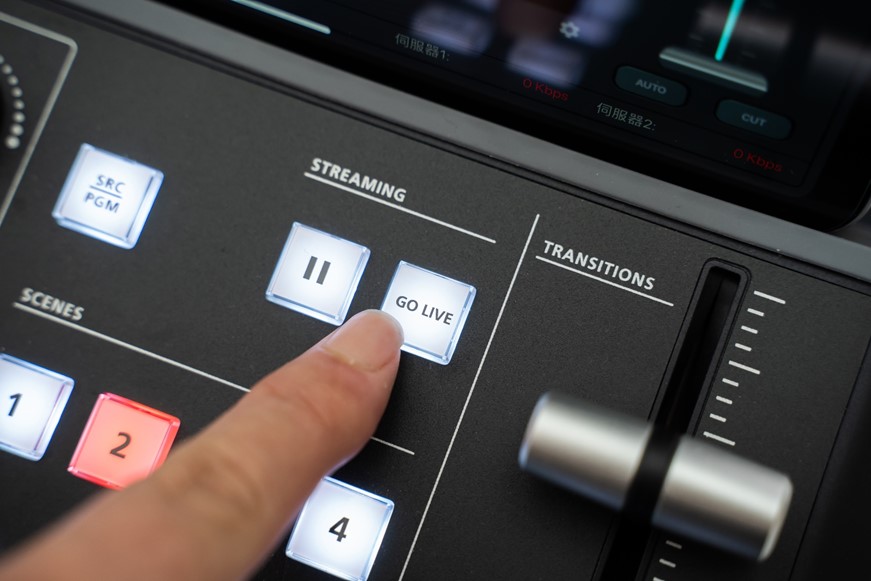 串流操作部份 SRC/PGM 是快速切換畫面;然後當都設定完成,按下 GO LIVE 就可以開始串流,也有具備隨時暫停的按鈕。