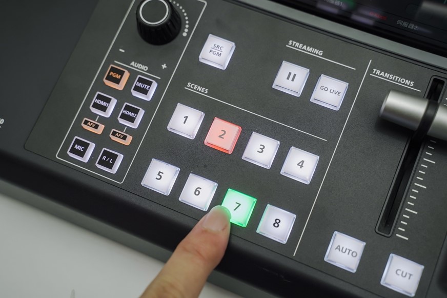場景可以設定 8 組快速切換使用,這部份是搭配 iPad 與專用 APP 設定使用,這裡場景按鈕切換有紅色與綠色燈光的顯示方式,簡單的概念就是紅色是主場景(直播進行中),綠色則是副場景