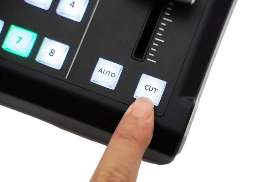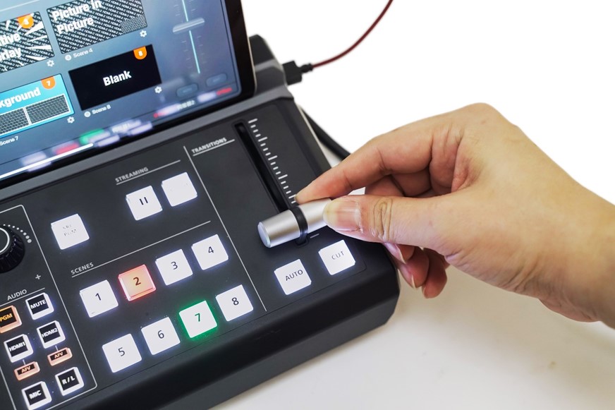 除了利用推桿,下方的按鈕 AUTO 則是依照設定的時間秒數自動轉場,CUT 則是馬上轉場