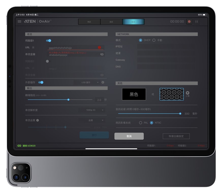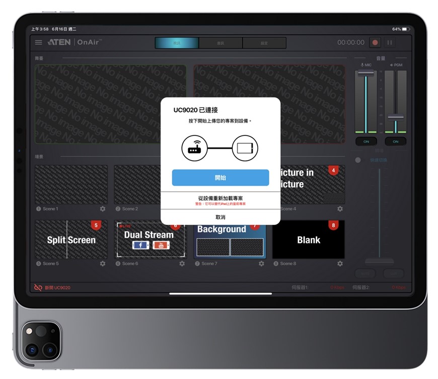 開啟 ATEN OnAir 後使用連接線將 UC9020 與 iPad 連接起來,連接時會將機器與 APP 數據同步,設定檔案也都會傳送到 UC9020 機器中,這也是一個設計的巧思,可以將設定跟著機器一起攜帶走。