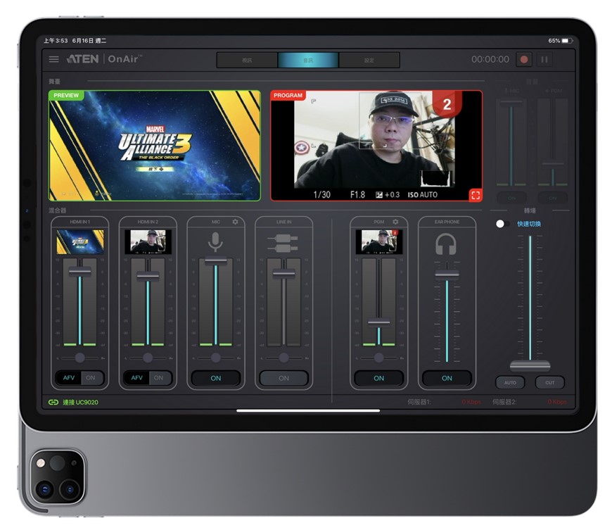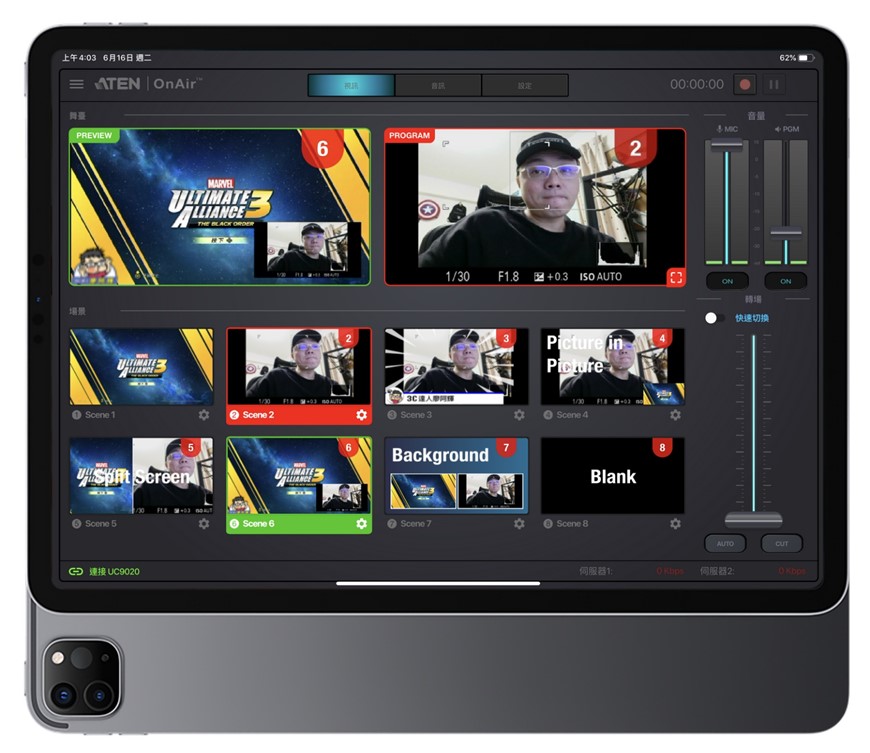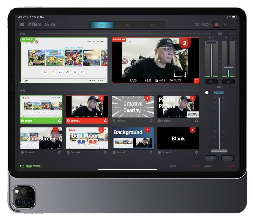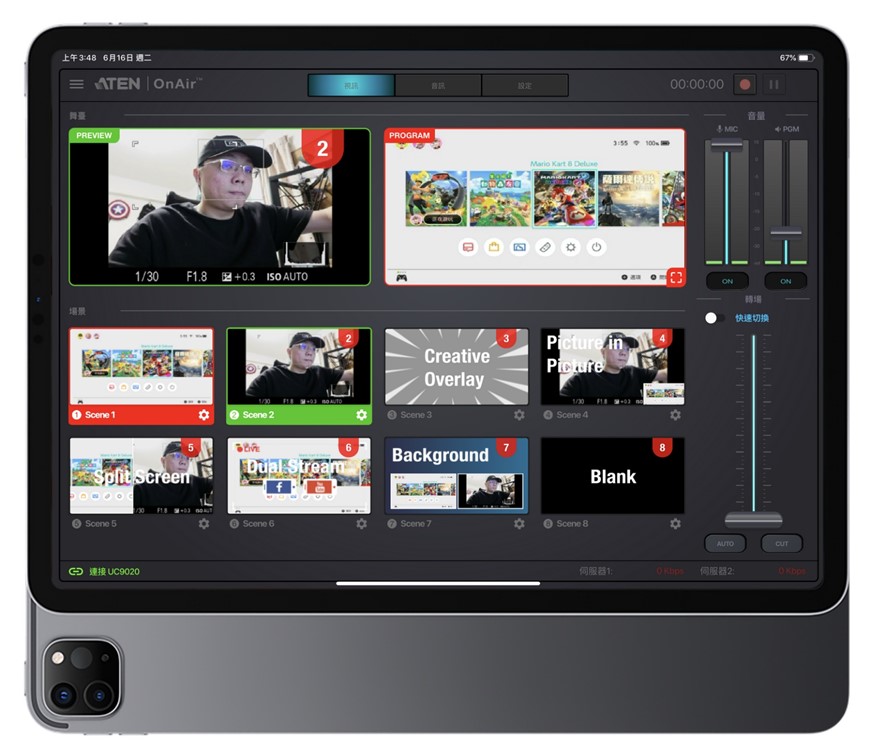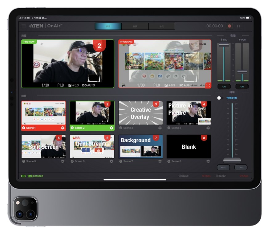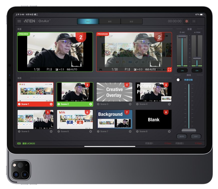設定好場景後其實在 ATEN OnAir 畫面中幾乎就是和 UC9020 的硬體控制完全搭配使用的,以場景來說就分別對應了八組按鈕,而線上 On Air (紅色) 與就緒 (綠色) 也一樣對應到 UC9020 的控制面板上的按鈕,因此可以說在 ATEN OnAir 上設計與布局,實際上直播時則是可以完全 100% 利用 UC9020 硬體按鈕與推趕來操作!