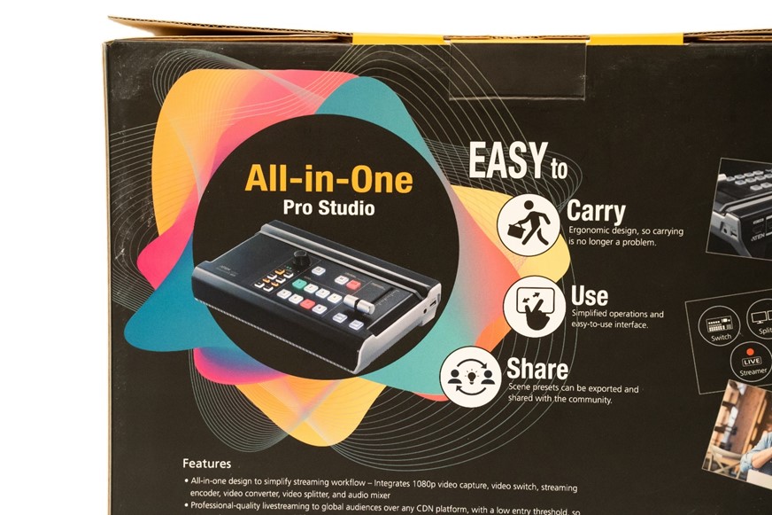 來開箱吧!ATEN UC9020 標裝上直接也標示了其特點:支援 1080P 解析度串流編碼、專用的 APP 應用程式、硬體切換與混音器、支援 4K60P 輸入直通可用於遊戲直播