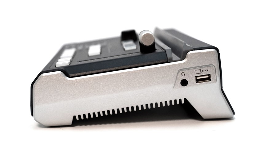 拿出 UC9020 主體,就是一個小巧但是功能齊全的縮小導播控制台樣子,包含了音訊控制、串流控制、場景快速切換、轉場切換等硬體按鍵與推桿,這也可以說是 UC9020 的核心重點,搭配專屬 APP 軟硬結合的使用方式遠比單純軟體滑鼠控制方便好多倍!
