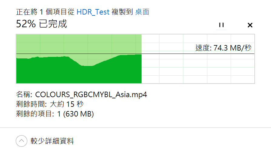 實際傳送 NAS 資料,直接就傳輸到了 74.3MB/s 的表現,可以說非常優異,實際傳輸速度已經非常接近理論傳輸速度。