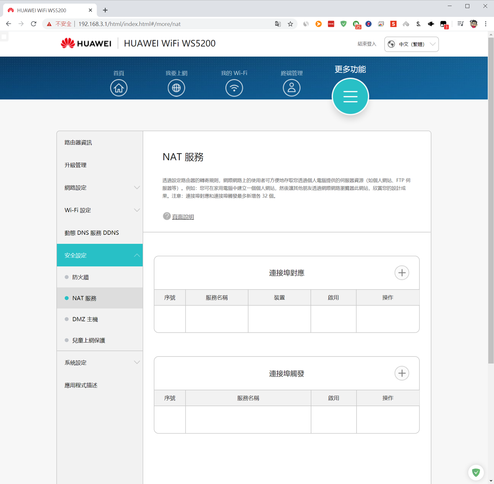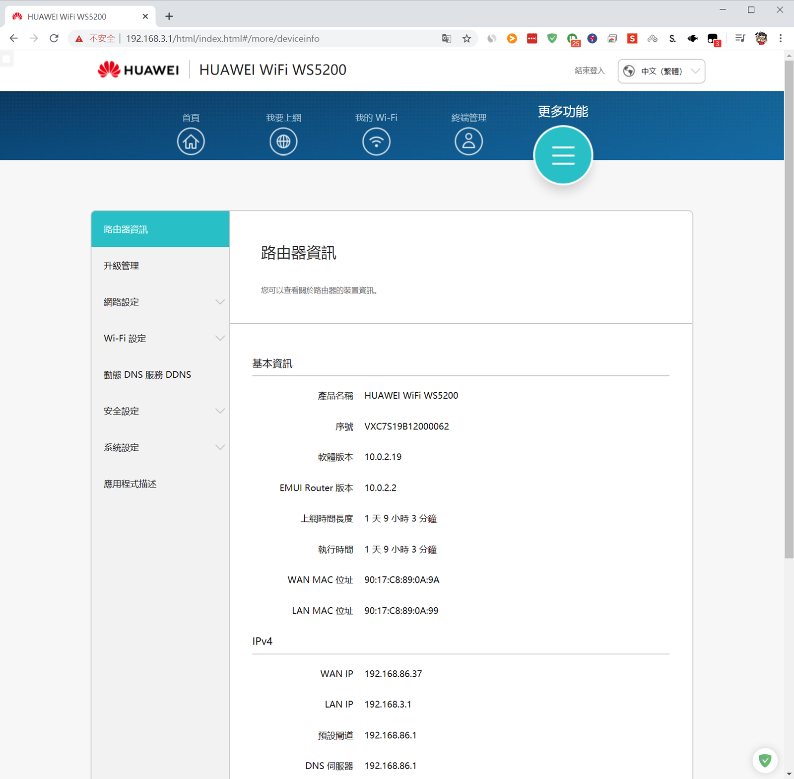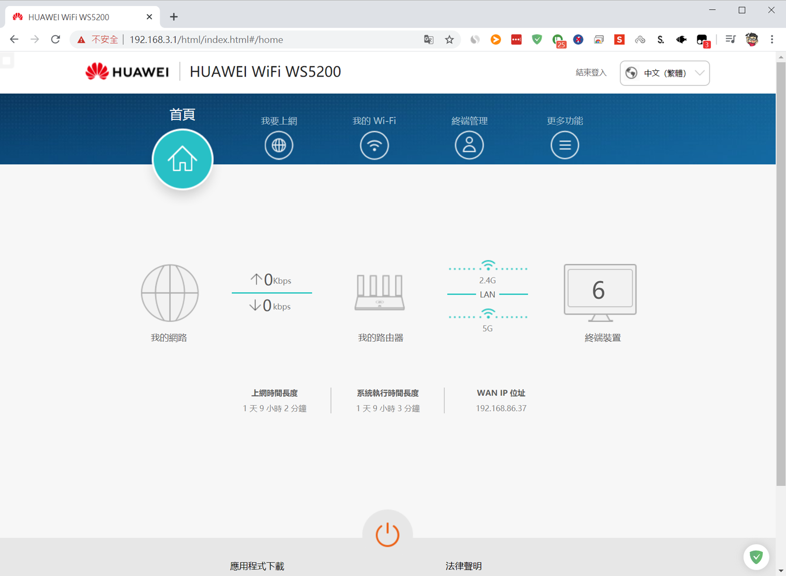 - 將第一台 HUAWEI WS5200 設定完成可以上網,這時候上面的指示燈應該是『綠色常亮的狀態』,我們先稱它為『主基地台』,另外一台我們則稱為『子基地台』。
