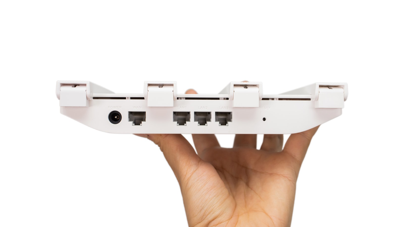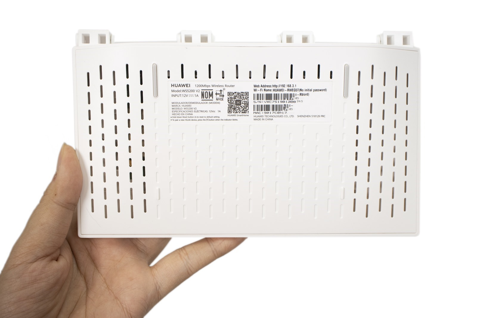 翻到機器背後的接口,HUAWEI WS5200 具備一組 WAN 三組 LAN,全都是 GbE 高速網路接口,最右邊為重設按鈕,沒有電源開關的設計,接上電源就會自動開機