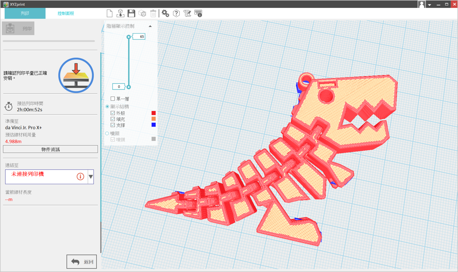 3D 模型切片可以直接連線也可以儲存到 SD 記憶卡離線列印,也有完整的線材預估、列印時間預測,列印過程模擬等完整功能。