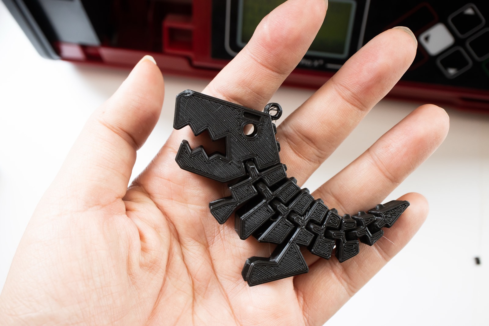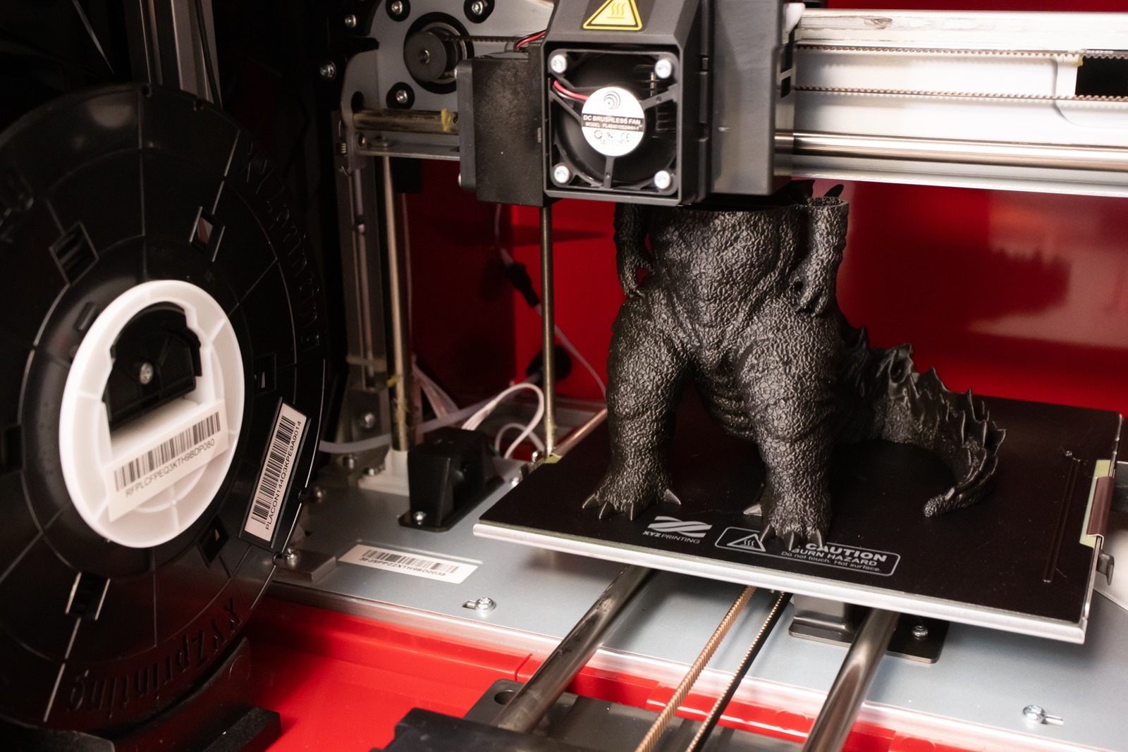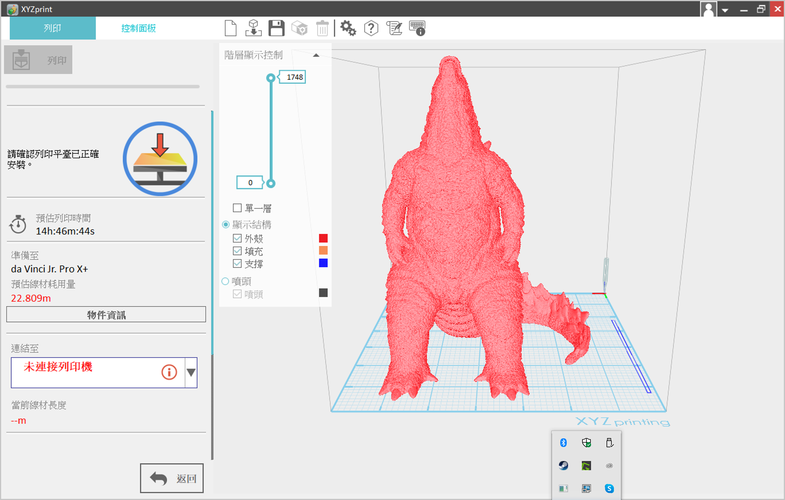 da Vinci Jr. Pro X+的可列印大小為 175 mm x 175 mm x 175 mm,要直接列印哥吉拉公仔也沒有問題,這隻哥吉拉為 0.1mm 層高,列印總時間 20 小時。