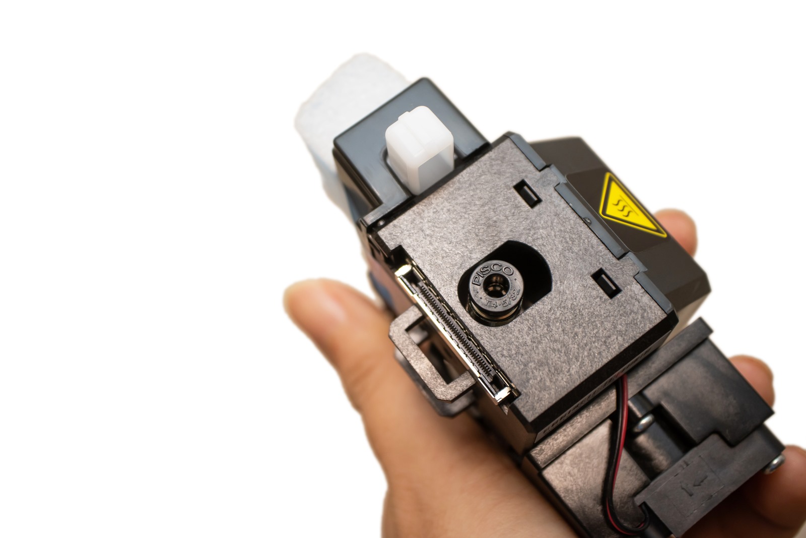 da Vinci Jr. Pro X+的噴頭已經是組裝完成一整組模組化的狀態,包含了噴頭、加熱模組、還有平台校正感應器於一體,線材也是整合設計並具備快拆接頭設計;模組化與快拆的設計讓噴頭更方便簡易的更換與維護,也可以依照需求另外購買高硬度噴頭甚至是雷射模組,高硬度噴頭可以用於列印像是內含碳纖維的 PLA 或是類金屬的 PLA 等特殊線材,雷射模組則可以讓 da Vinci Jr. Pro X+3D 列印機也兼具雷射雕刻機的功能。