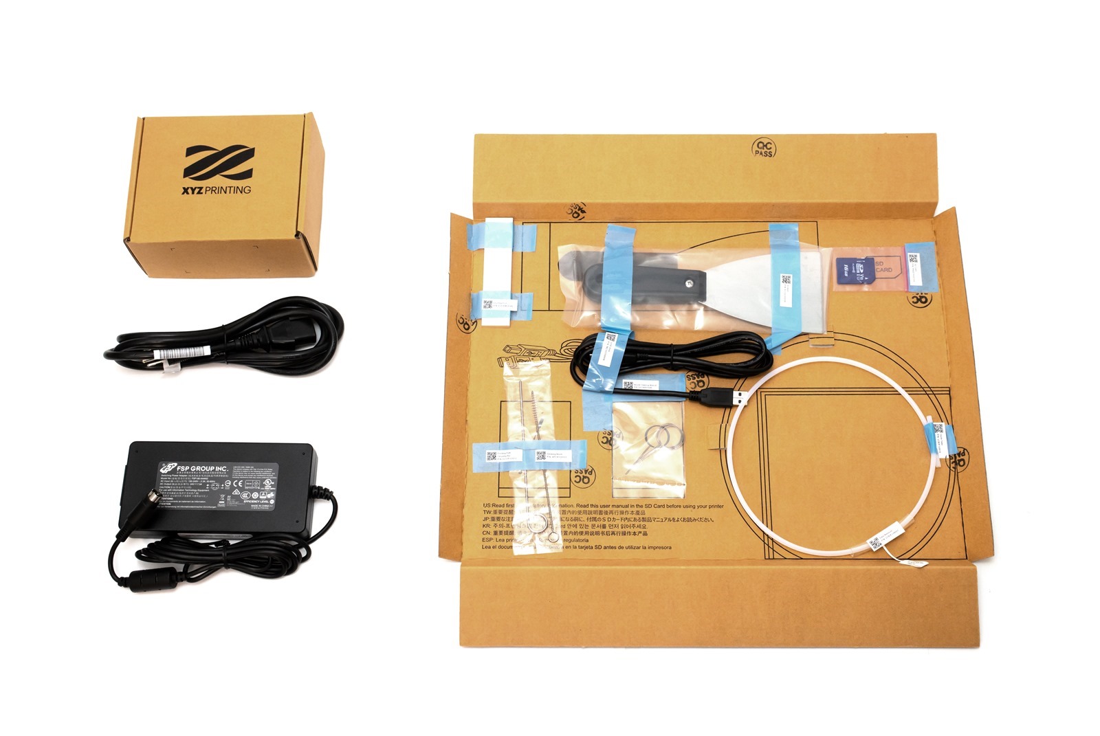 箱子中除了本體已經組裝完成的 da Vinci Jr. Pro X+列印機,其他的配件阿輝也一次列給大家參考,左上是快拆式模組化噴頭,左下為電源供應器,配件紙盤則有進料鐵弗龍管、 USB 傳輸線、 SD 記憶卡、去列印件用的鏟刀,清潔噴頭的工具也給滿了全套。