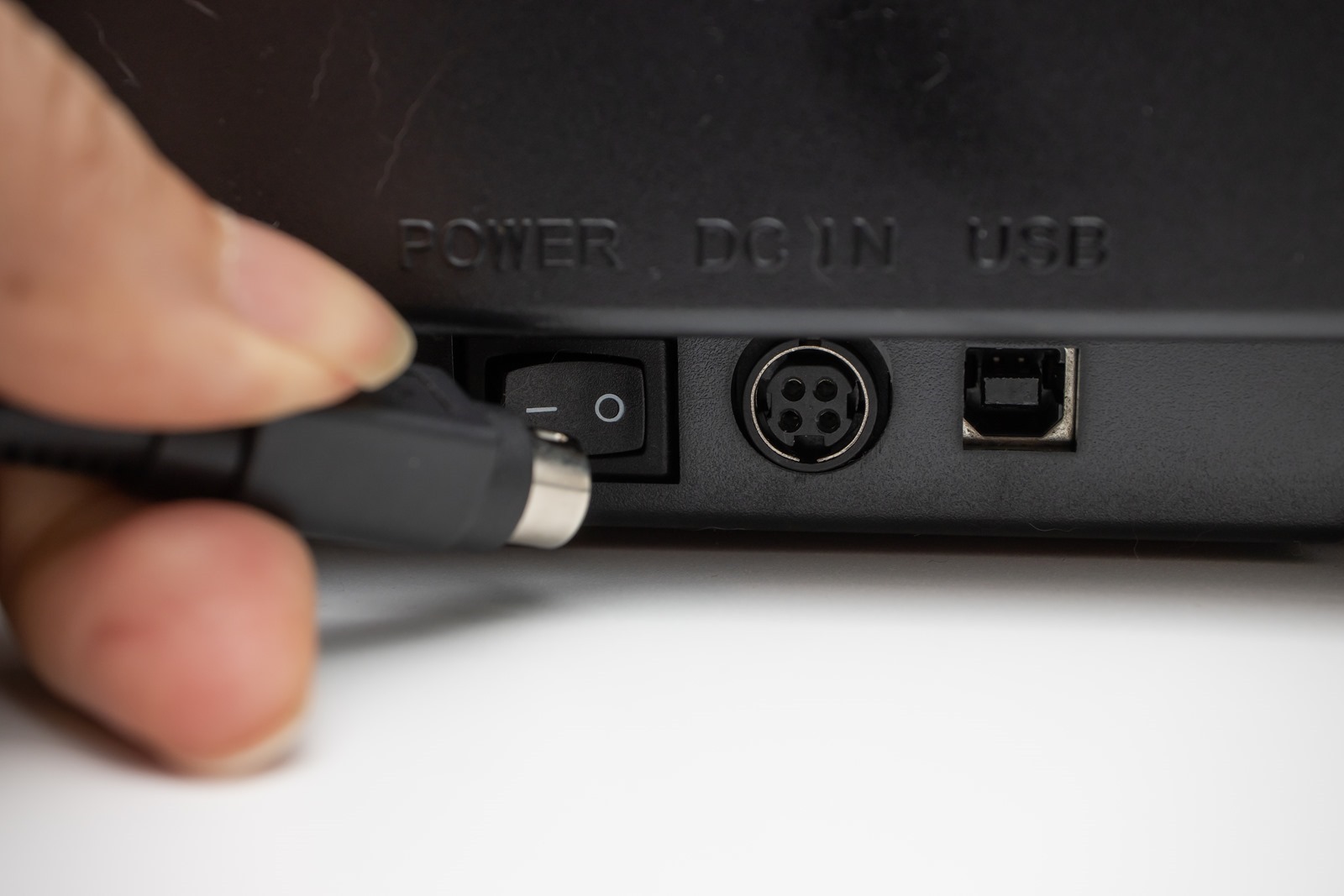 然後我們也來安裝電源變壓器吧!da Vinci Jr. Pro X+的電源開關、 USB 連接埠與電源變壓器連接線都設計在機器的右側,都有線材防呆設計,插入即可