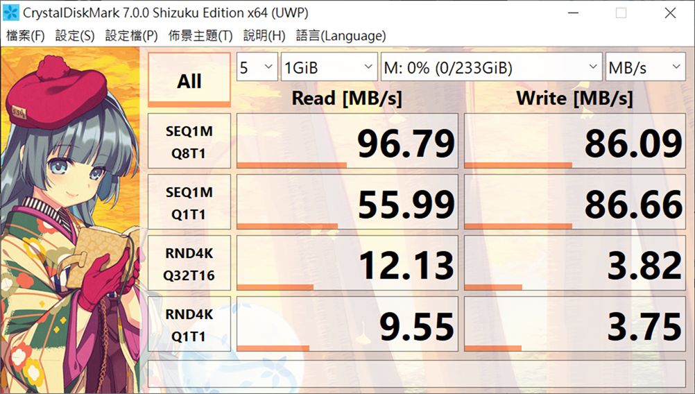 電腦實測方面使用 KingSton USB 3.0 讀卡機測試,成績接近速度 97 MB/sec,寫入 75 MB/sec